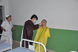 入院当天医护人员为其理发、洗澡、换洗衣物
