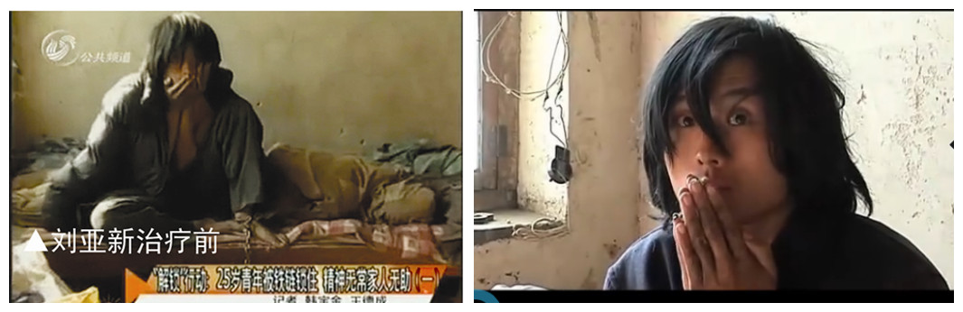 从此以后刘亚新不仅变得邋遢不讲卫生,而且脾气也变得极为暴躁,时常摔砸东西、打人骂人。2009年开始,病情加重的刘亚新终止了与外界的联系,无论是谁,他都不再说一句话。由于担心儿子跑出去伤人,甚至一去不返,万般无奈之下,他的家人只能用一根铁链将他锁了起来。