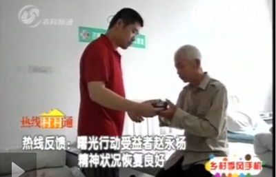 村村通的记者2010年5月31日赶到了赵海村解情况。赵永杨的母亲打开紧锁的大门,带着我们见到了被关在家里的赵永杨,记者刚见到赵永杨时要比预想的要好一些,刚开始交流,赵永杨还显的比较正常。记者问什么赵永杨都能回答,知道自己的精神不太好,只不过赵永杨说自己精神不太好是由于肺炸引起的,然而和记者交流的时候他的眼神一直飘忽不定。